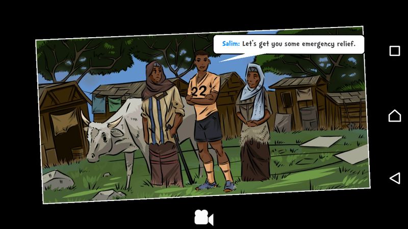 Vel framme i leiren møter vi et nytt minispill. De nyankomne skal registreres og få utdelt det de trenger av mat, drikke og medisiner. Det gjøres i et morsomt gameplay hvor du får vite hva hver flyktning trenger, og har noen sekunder på å sende dem til riktig utdelingsstasjon. Hvis du jobber for sakte, gir de opp og går sin vei. En kravstor gjeng, med andre ord. Jeg stiller meg igjen spørsmålet om hva de skal lære av spillet. At det er smart å registrere nyankomne, og at de ofte er sultne og tørste? Det stemmer jo, men blir vel trivielt som læringsmål? Utviklernes svar på min kritikk av gameplayet, ville nok være at læringen skjer gjennom de tegneserieliknende tablåene mellom minispillene. Disse mellomspillene gir vesentlig mer relevant og realistisk innhold til spillet, men er altså helt løsrevet fra det spilleren faktisk settes til å gjøre. Minispillene blir en belønning for tålmodige lærende (som forresten bare kan klikke seg videre hvis de ikke gidder å lese historien), ikke elementer som faktisk bidrar til å gi innsikt i problematikken.